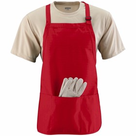 Augusta Medium Length Apron w/ Pouch: Colors are 65% polyester/35% cotton twill * 1-inch wide neck strap with slider adjustment * 1-inch wide waist ties, reinforced at stress points * Triple-divided pouch pocket * Rounded bottom with self-fabric binding * 22" x 24"