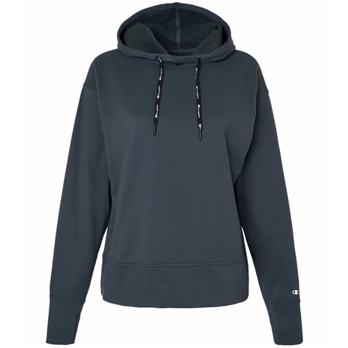 Champion - Women's Sport Hooded Sweatshirt 5.4 oz./yd², 95/5 recycled polyester/spandex fleece Relaxed fit Crossover single-ply hood Champion logo drawcord Single-needle stitching at armhole and neck Double-needle stitching at cuffs and waistband Self-fabric cuffs and waistband Thumbhole on cuffs Reflective "C" logo on left sleeve